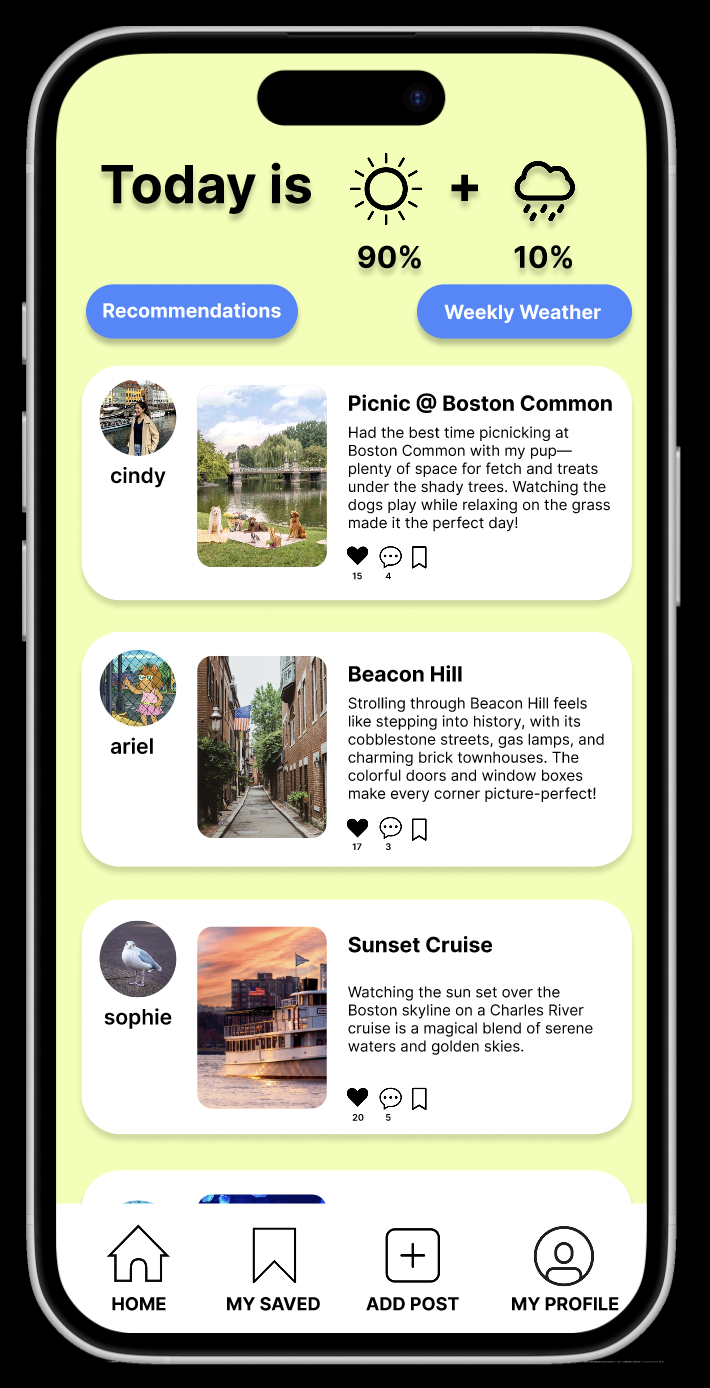 Bostoning prototype is your guide to discovering Boston’s best through the eyes of your peers. Designed for Wellesley College seniors who often struggle to find engaging activities beyond academics, the platform curates personalized recommendations based on the weather. Students can share their experiences and receive peer-driven suggestions that make it easy to enjoy the city—rain or shine.